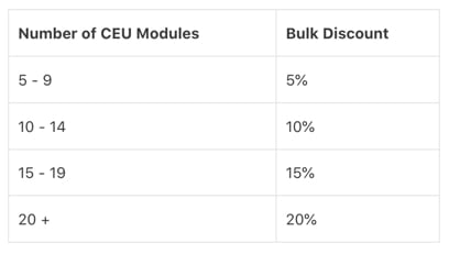 We now offer bulk discounts for CEU modules. The more modules you buy, the more you save!